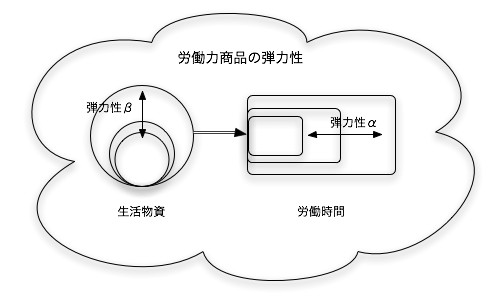 一定の生きた労働Tを引きだすのに、どれだけの生活物資Bが必要か、をめぐる弾力性 T -> B,B',....